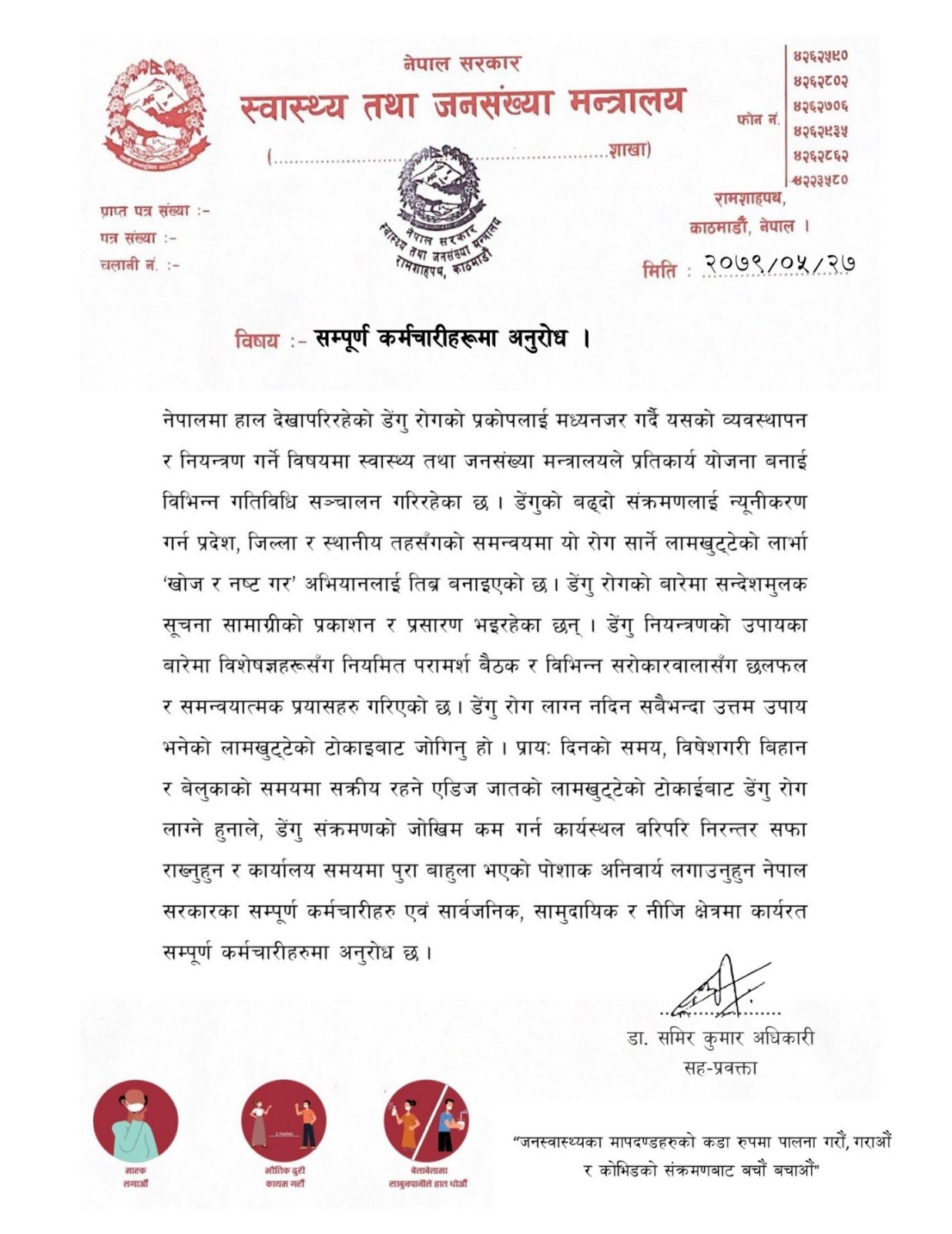 स्वास्थ्य मन्त्रालयले दियो डेंगुको प्रकोपबाट बच्न आफ्ना कर्मचारीलाई टिप्स