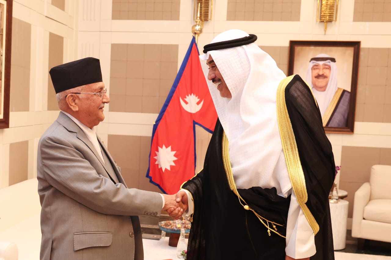 प्रधानमन्त्री ओली र कुवेतका राजकुमार एवं प्रधानमन्त्री सबाहबीच कुवेतको स्थायी नियोगमा भेटवार्ता