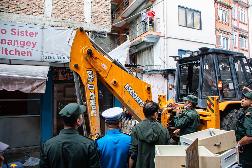 महानगरको डोजर चल्याे माछापोखरी क्षेत्रको अनधिकृत संरचनामाथि