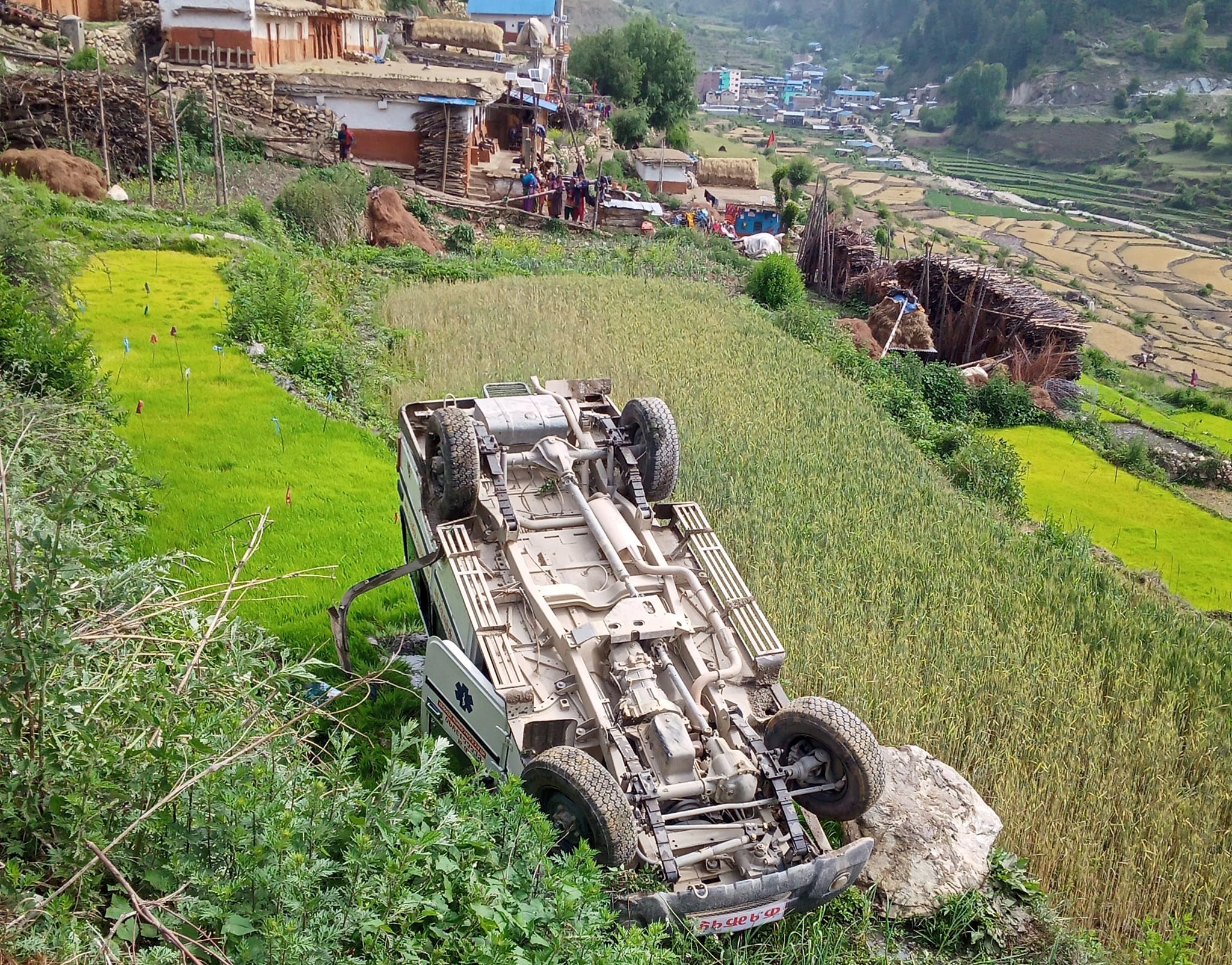 कनकासुन्दरीमा बिरामी बाेकेको एम्बुलेन्स दुर्घटना, तीन जना घाइते