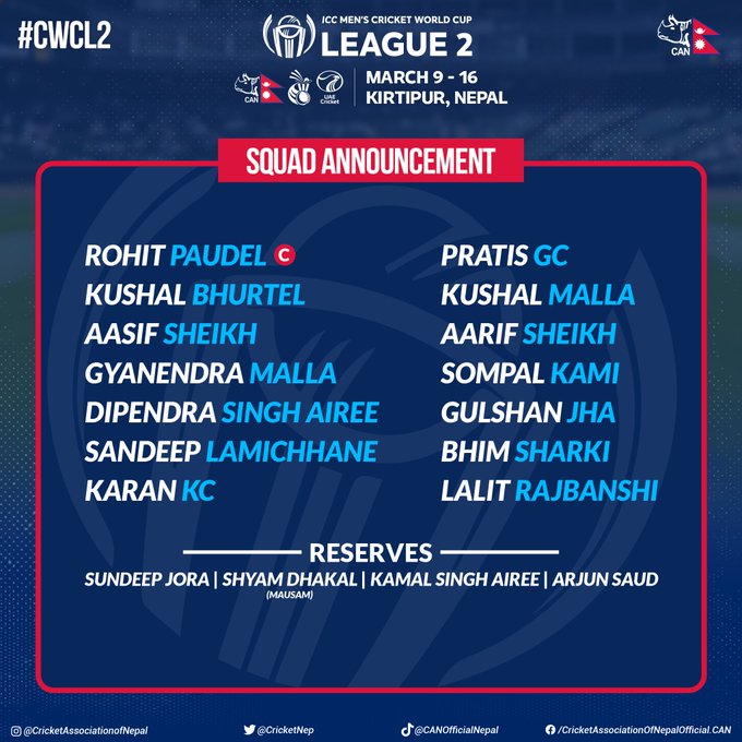 आइसिसी विश्वकप लिग २ः युएई र पीएनजीसँग खेल्ने नेपाली क्रिकेट टोलीको घोषणा