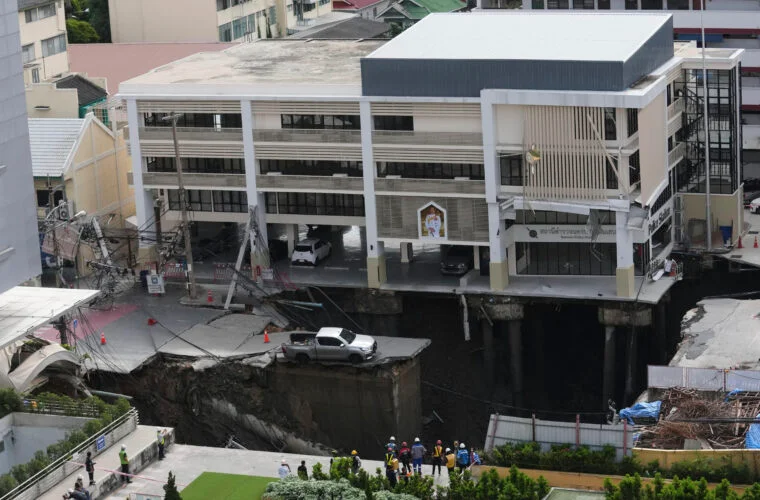 बैङ्ककमा सडक भासिँदा ठूलो खाडल, यातायात अवरुद्ध